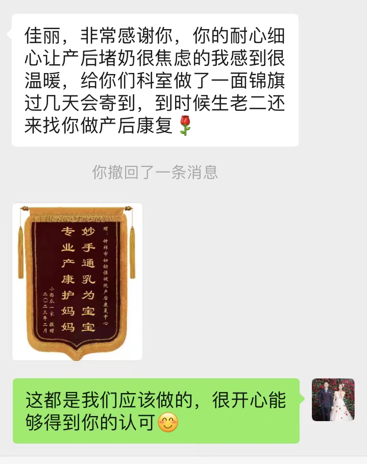 经女性健康管理中心副护士长王佳丽检查后,发现小西瓜妈妈的双乳肿胀的厉害,乳腺管严重堵塞。治疗期间,经过几次手法按摩疏通,乳房很快就消肿了,疼痛感也明显消失,奶量也逐渐增加。为了缓解小西瓜妈妈焦虑的情绪,王佳丽耐心地科普如何正确母乳喂养,详细讲解哺乳期注意事项,并教她出现生理性涨奶如何进行自行疏通。同时,王佳丽主动添加小西瓜妈妈的微信号,经常在线上跟进涨奶、堵奶等情况。短短1个多月的交流沟通,小西瓜妈妈被王佳丽暖心服务深深打动:“王护士长不仅帮我解决了涨奶痛,待人也特别亲切有耐心,生二胎还会选择来妇幼保健院找王佳丽做产后康复!”