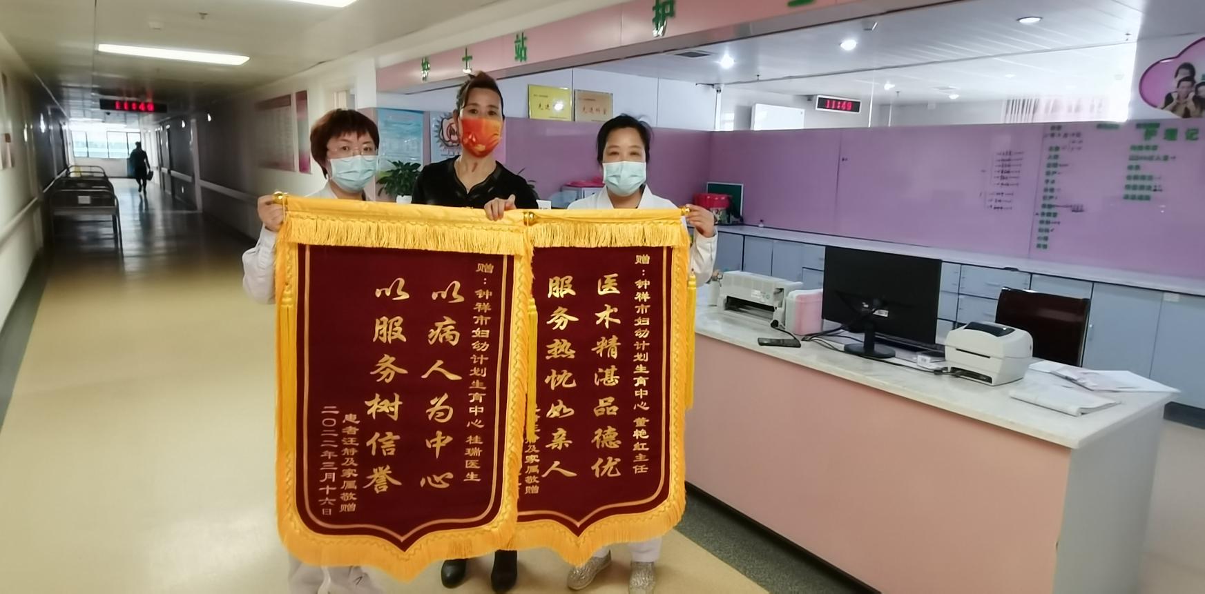 3月16日上午,钟祥市妇幼保健院妇女保健部部长董艳红和主治医师桂瑞依旧如往常一样,兢兢业业的忙于日常工作。同样这天也是患者汪女士出院的日子,她激动的心情无以言表,为了感谢董部长和桂医生50多天的治疗和关心,特在出院之际赠送两面锦旗以示谢意!